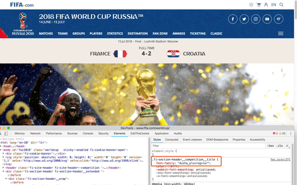 在《FIFA世界杯符号使用指南》明确了2018年俄罗斯世界杯图案、Logo、吉祥物、以及字体等。明确DUSHA字体为世界杯指定字体、是专门为本赛事设计使用的字体。
