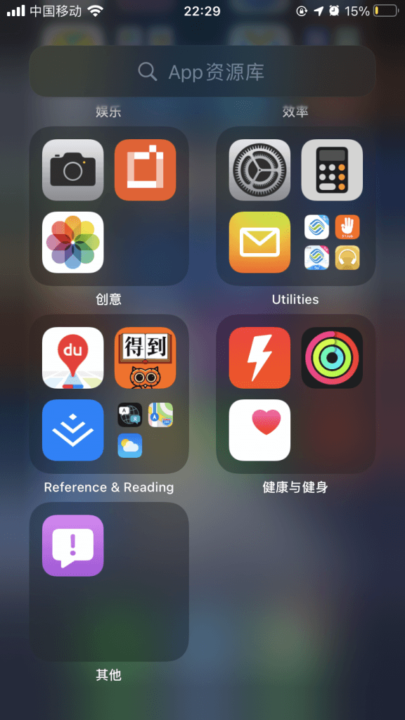 让我喜欢的是,在最后的一屏添加了AppLibrary功能,就是将所有App进行自动的分类,也可以用查找搜索App,其实之前IOS13我查找App是通过下拉点击常用的App或者搜索,很少使用翻页自己去找,因为大多数常用的App那么几个,下拉推荐已经给你选择好了,不用来回翻页去找,这次IOS添加AppLibrary我觉得是对此强化,我觉得AppLibrary这次应该是解决的一大部分人的痛点了,至少是我的痛点。